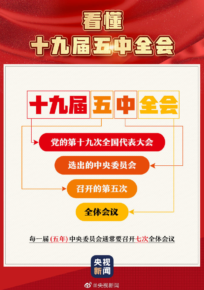 中國共產(chǎn)黨第十九屆中央委員會第五次全體會議,于10月26日至29日在北京舉行。主要議程是,中共中央政治局向中央委員會報告工作,研究關于制定國民經(jīng)濟和社會發(fā)展第十四個五年規(guī)劃和二〇三五年遠景目標的建議。今天,一組圖帶你了解十九屆五中全會↓↓