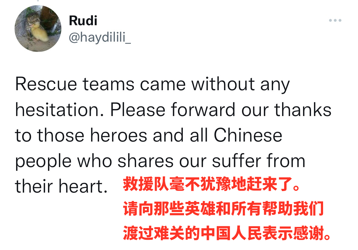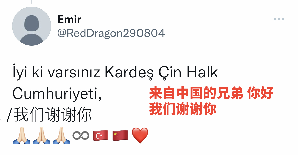 2023-02-16 21:36:48 來源:中國(guó)日?qǐng)?bào)網(wǎng) 責(zé)任編輯:黃麗紅 作者:2月6日,土耳其發(fā)生兩次7.8級(jí)地震,中國(guó)政府和社會(huì)力量隨即對(duì)土耳其進(jìn)行緊急援助,充分體現(xiàn)了中國(guó)人民的國(guó)際人道主義精神和大愛無疆的情懷,以及中國(guó)人民對(duì)土耳其人民的友好情誼。 土耳其人民紛紛在社交媒體上表達(dá)對(duì)中國(guó)的感謝。 ![]() ![]() ![]() ![]() 還有土耳其網(wǎng)友用中文和漢語拼音表達(dá)對(duì)中國(guó)救援隊(duì)的感謝。 ![]() ![]() ![]() 土耳其人民也用自己的方式表達(dá)了對(duì)中國(guó)和中國(guó)救援隊(duì)的愛。 ![]() ![]() |