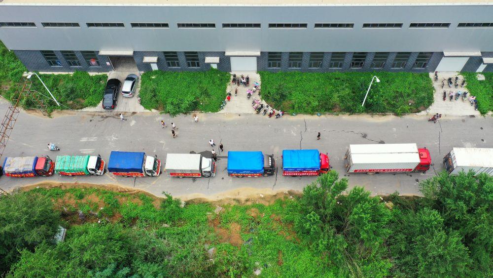 △河北涿州鋼研物資儲(chǔ)備點(diǎn)外,運(yùn)送物資的車輛排起長(zhǎng)隊(duì)。