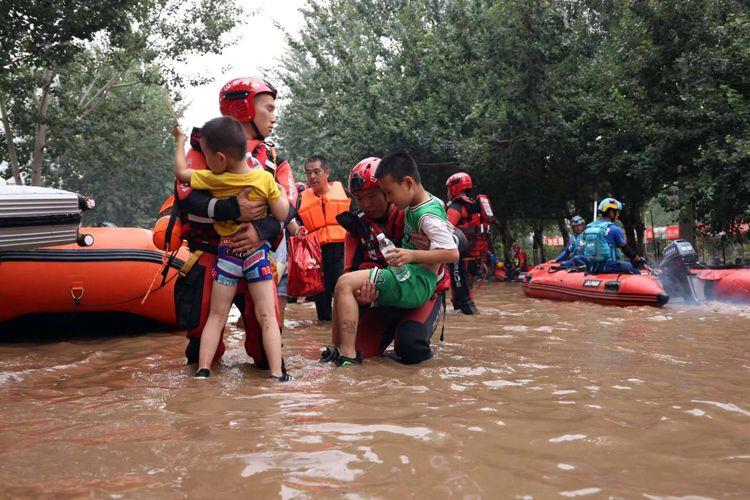 △8月3日,河北涿州北二環(huán)附近,山東消防救援人員抱著孩子通過(guò)積水路段。
