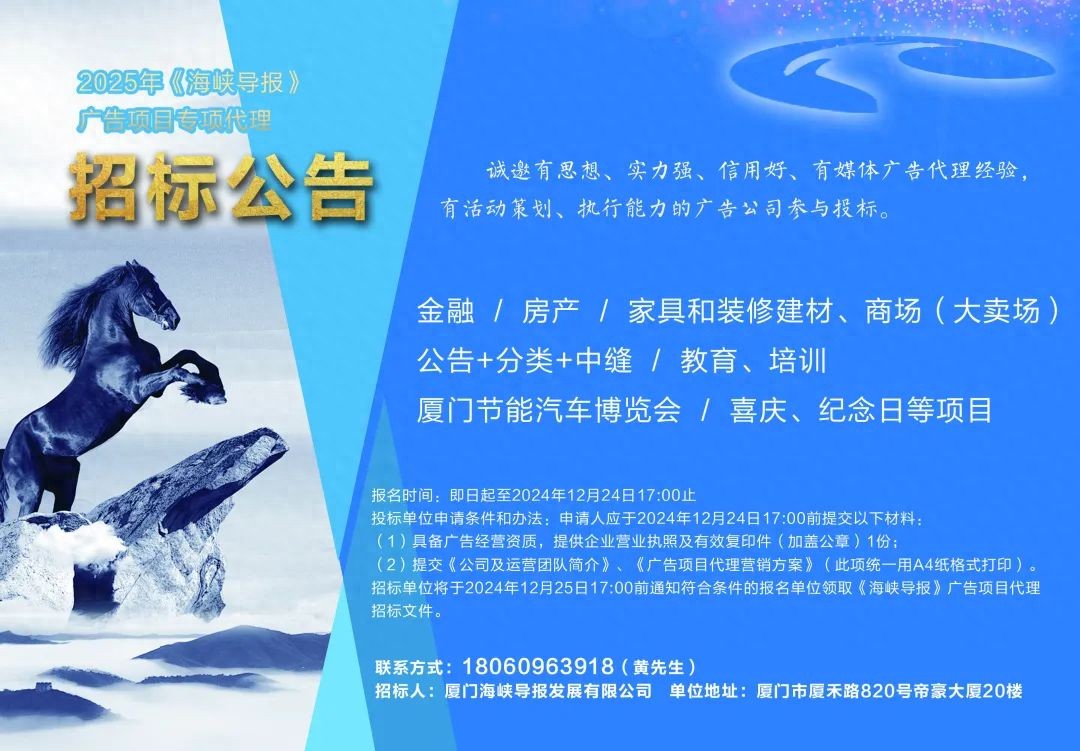 招標單位將于2024年12月25日17:00前通知符合條件的報名單位領(lǐng)取《海峽導報》廣告項目代理招標文件。