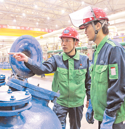 潘從明(左)在指導(dǎo)班組成員操作設(shè)備。 本報記者 趙帥杰攝