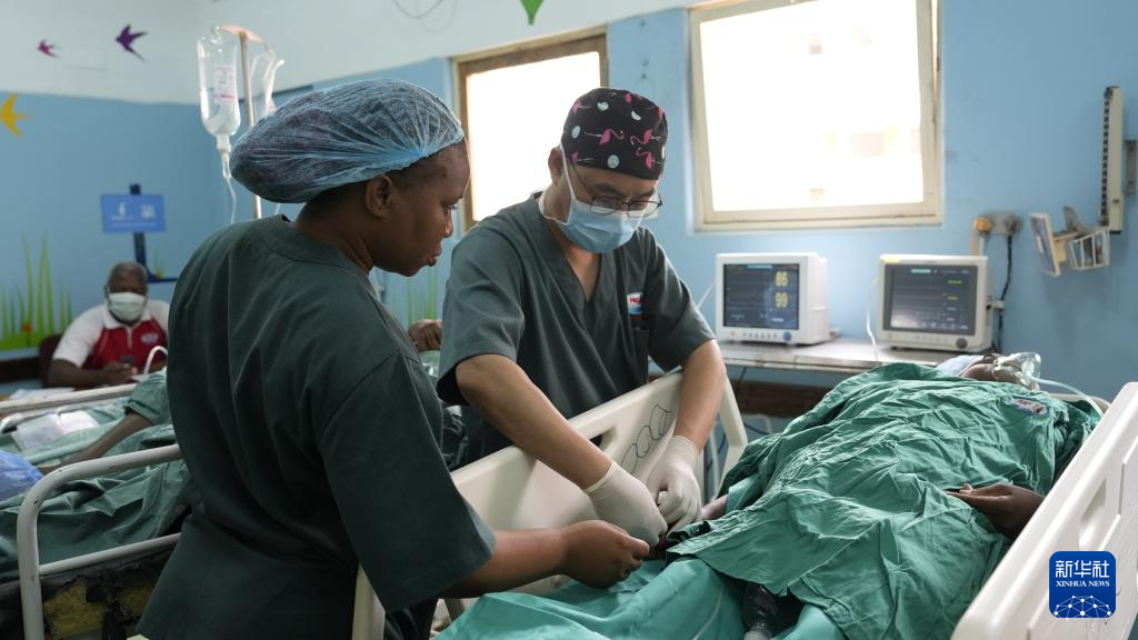 4月11日,在莫桑比克馬普托,中國援莫醫(yī)療隊醫(yī)生凌勇(右)和當(dāng)?shù)蒯t(yī)護(hù)人員對病人進(jìn)行術(shù)后護(hù)理。新華社記者 劉杰 攝 |