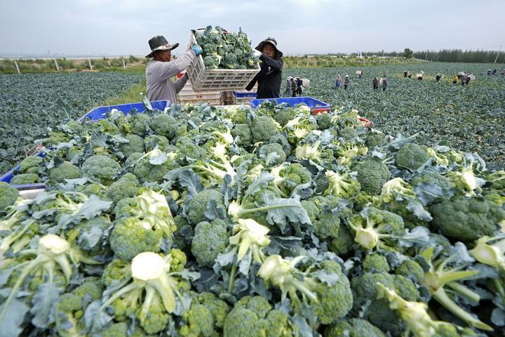 2025年7月18日,工作人員在寧夏固原市原州區(qū)彭堡鎮(zhèn)萬畝冷涼蔬菜基地運(yùn)輸西蘭花。固原依托高海拔、氣候冷涼等“冷資源”優(yōu)勢,大力發(fā)展冷涼蔬菜產(chǎn)業(yè),著力打造“六盤山冷涼蔬菜”區(qū)域公用品牌。目前已建成冷涼蔬菜規(guī)?;N植基地130余個,種植面積穩(wěn)定在50萬畝,年產(chǎn)鮮菜200萬噸以上?!傲P山冷涼蔬菜”這張打造的“綠色名片”,已成為當(dāng)?shù)剜l(xiāng)村振興發(fā)展之路上的“熱產(chǎn)業(yè)”。