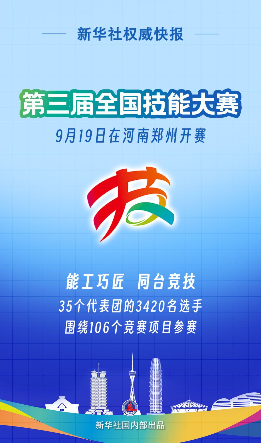 第三屆全國技能大賽9月19日在河南鄭州開賽,35個(gè)代表團(tuán)的3420名選手圍繞106個(gè)競賽項(xiàng)目參賽,賽事活動(dòng)為期5天。