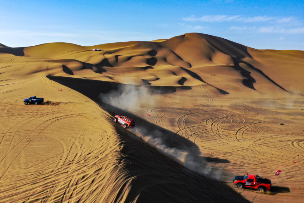 賽車在庫木塔格沙漠里馳騁(無人機(jī)照片)。周鵬 攝