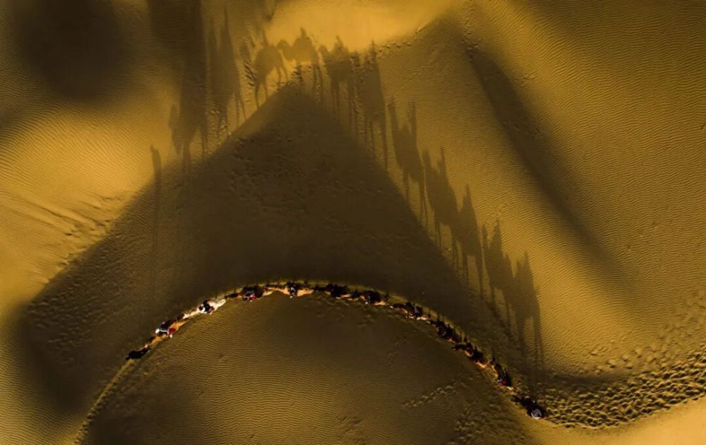 游客騎著駱駝在尉犁縣羅布人村寨欣賞沙漠美景(無人機(jī)照片)。新華社記者 趙戈 攝