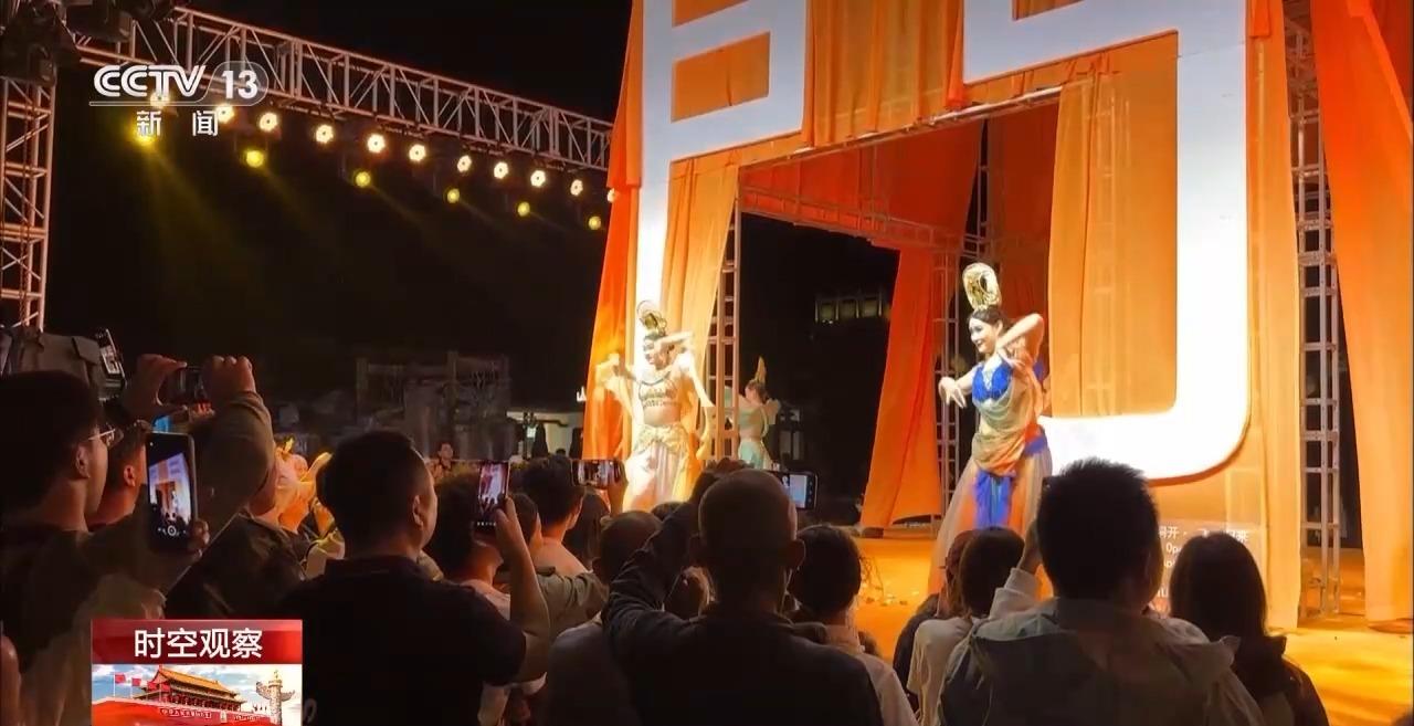 鳳凰剛過,敦煌古樂隨即響起。在天門洞這座天然畫框前,五位“飛天”舞者身著敦煌霓裳登場,民俗與山水在此刻完美交融。