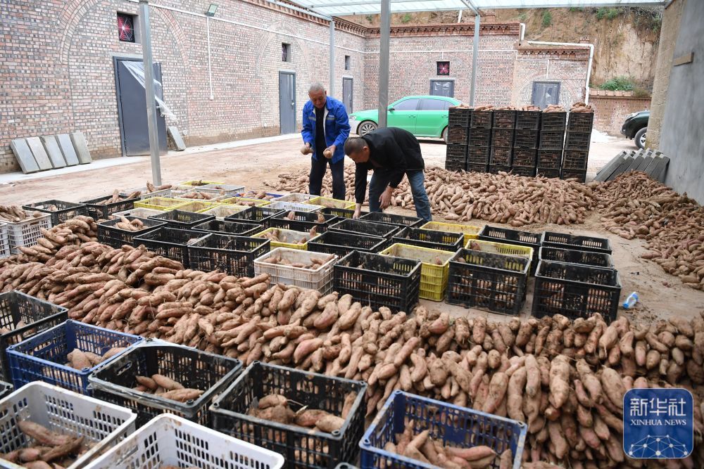 ↑ 10月16日,延安市寶塔區(qū)甘谷驛鎮(zhèn)羅家灣村村民在整理收獲的紅薯。新華社記者 邵瑞 攝