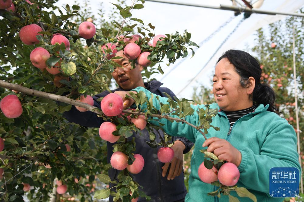 ↑ 10月17日,果農(nóng)在延安市寶塔區(qū)橋溝街道煙洞溝村采收蘋果。新華社記者 張博文 攝