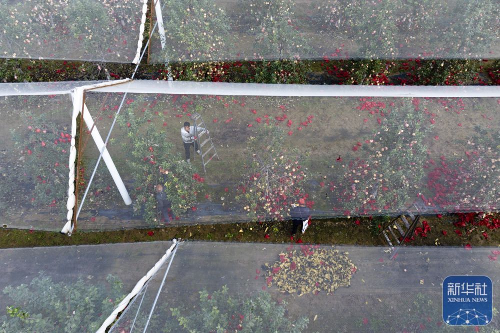↑ 10月17日,果農(nóng)在延安市寶塔區(qū)橋溝街道煙洞溝村蘋果園內(nèi)摘掉蘋果套袋(無人機照片)。新華社記者 邵瑞 攝