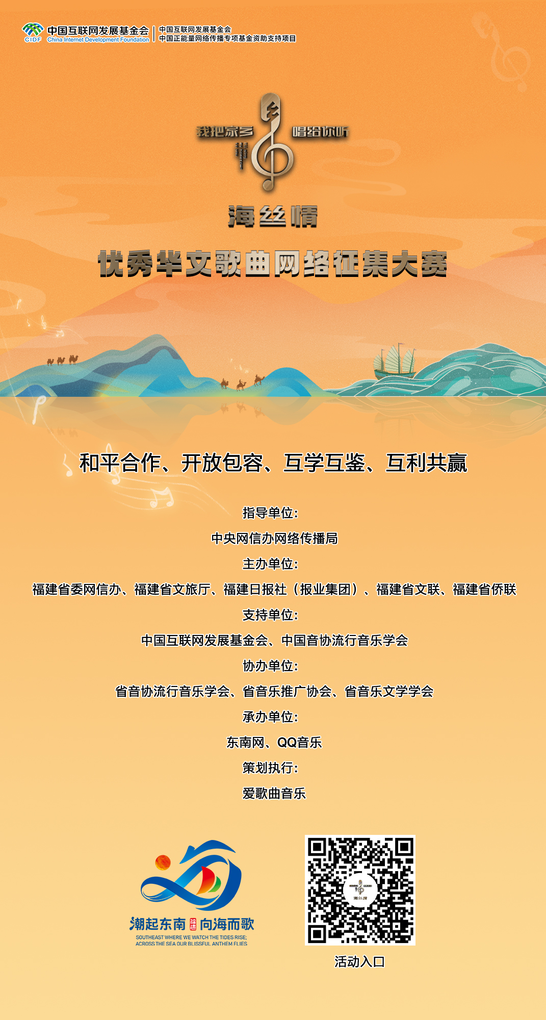 “海絲情·我把家鄉(xiāng)唱給你聽”優(yōu)秀華文歌曲網(wǎng)絡征集大賽,由中央網(wǎng)信辦網(wǎng)絡傳播局指導,福建省委網(wǎng)信辦、福建省文旅廳、福建日報社(報業(yè)集團)、福建省文聯(lián)、福建省僑聯(lián)等主辦?;顒拥玫搅酥袊ヂ?lián)網(wǎng)發(fā)展基金會中國正能量網(wǎng)絡傳播專項基金資助支持。(本網(wǎng)記者 吳開興)