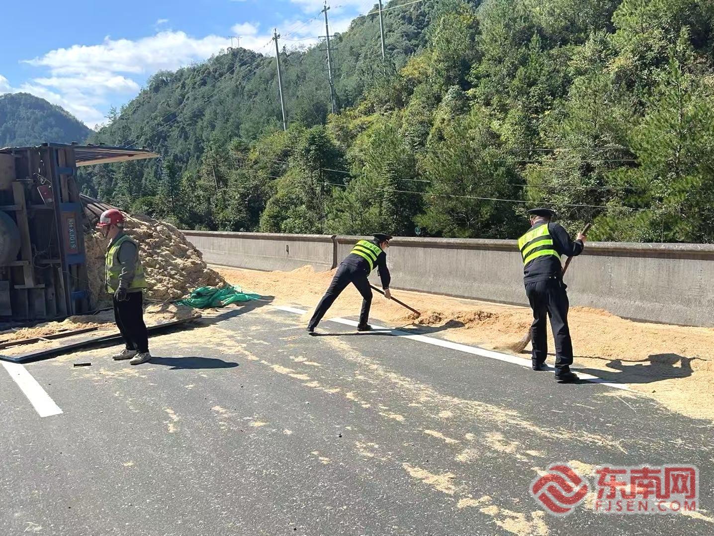 東南網(wǎng)10月24日訊(通訊員 李思澄 劉曉涌)10月23日中午,寧上高速發(fā)生一起貨車側(cè)翻事故,所載鋸粉大量?jī)A灑,導(dǎo)致主干道通行受阻。寧德高速執(zhí)法支隊(duì)周寧中隊(duì)接警后火速出動(dòng),聯(lián)合相關(guān)部門經(jīng)過緊張?zhí)幹?,于?dāng)日15時(shí)40分成功排除險(xiǎn)情,恢復(fù)道路正常通行。 23日12時(shí)09分,寧德高速執(zhí)法支隊(duì)周寧中隊(duì)接到報(bào)警稱:在寧上高速A83K+900處,一輛貨車發(fā)生側(cè)翻,貨物灑落主干道。中隊(duì)執(zhí)法人員聞?dòng)嵙⒓幢几艾F(xiàn)場(chǎng),經(jīng)現(xiàn)場(chǎng)確認(rèn),側(cè)翻貨車運(yùn)載的為鋸粉,因包裝破損大面積灑落,形成安全隱患,嚴(yán)重影響交通安全。