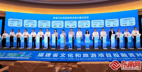 活動現場。東南網記者 林婕 攝 在福建省重點文旅項目簽約儀式上,共有36個文旅重點項目集中簽約,包括區(qū)域協(xié)作、政企合作、產業(yè)對接、招商合作、銀企合作等項目。其中招商合作項目27個,總投資267.43億元,銀企合作項目9個,融資額度83.35億元。簽約的招商引資項目中,總投資10億元以上項目有9個,包括德化觀音岐古鎮(zhèn)項目(50億元,合同),永春安騰十里桃源項目(30億元,合同),泉港惠嶼電影島項目(30億元,合同),石獅東方萬佳城市新天地項目(23億元,合同),南安大盈溪流域田園風光建設項目(20億元,合同),福州中洲島文商旅綜合體項目(10億元,意向)。銀企合作項目中,福建省旅游發(fā)展集團與建行福建省分行戰(zhàn)略合作協(xié)議,融資50億元。 在上午召開的全省文旅經濟發(fā)展大會上,簽約重大項目17個、投融資約236億元。今年以來,全省各地深化拓展省委“深學爭優(yōu)、敢為爭先、實干爭效”行動,掀起拼文旅經濟、抓項目建設的熱潮。各地先后有106個文化和旅游重點招商項目達成合作共識,總投資1183.42億元;其中10億元以上項目38個,總投資1023.73億元。14個銀企合作項目成功對接,總投資249.23億元,融資需求162.9億元。 對接會上,還舉行了福建省文旅經濟產業(yè)鏈招商重點項目專欄上線儀式。該專欄在省文旅廳官網推出,內容涵蓋產業(yè)政策、重點招商項目、中國-海峽創(chuàng)新項目成果交易平臺文化和旅游項目、建設項目成果展示等板塊,著力構建線上線下一體、永不落幕的項目對接、成果展示、文旅推介的嶄新平臺。