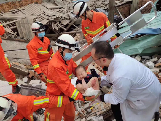 現(xiàn)場指揮部研究部署救援方案 現(xiàn)場指揮部迅速制定詳細(xì)救援方案,在確保被困人員安全前提下,堅持“先易后難、由淺及里”的方針,集中力量在最有可能埋壓人員的區(qū)域打通多個小作業(yè)面,由搜救犬和生命探測儀對局部坍塌建筑實施搜索定位,確定被困人員位置后,破拆攻堅組隨即跟進(jìn)實施救援。 6時35分,搜救組先后確認(rèn)3名被困人員位置,破拆作業(yè)迅速展開。 7時10分,福州支隊指戰(zhàn)員在坍塌建筑分別開辟出3處救援通道,2名被困人員先后成功獲救,均無生命危險。 7時55分,現(xiàn)場一條搜救犬搜索定位出四名被困人員,其中1名男嬰、1名女童。 確定被困人員后,救援人員迅速跟進(jìn)展開救援。根據(jù)被困者周邊情況,指戰(zhàn)員首先利用起重氣墊,在倒塌樓板下支撐起近半米的救援作業(yè)空間,采取安全防護(hù)與快速清理救援相結(jié)合的方式,不斷加快救援進(jìn)度。 8時26分,1名男嬰和1名女童相繼被救出;隨著救援空間的不斷擴(kuò)大,又1名被困女性也隨即被救出;在她的指引下,指戰(zhàn)員又發(fā)現(xiàn)一名被困男性。