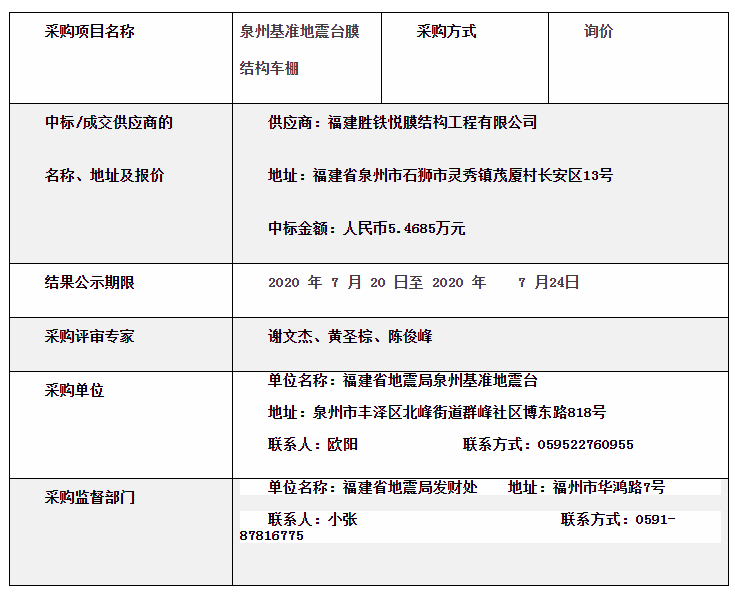 泉州基準(zhǔn)地震臺膜結(jié)構(gòu)車棚采購結(jié)果公告