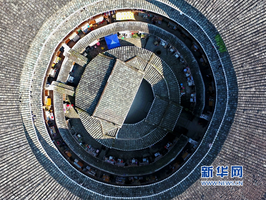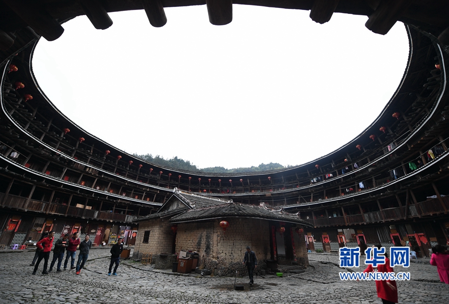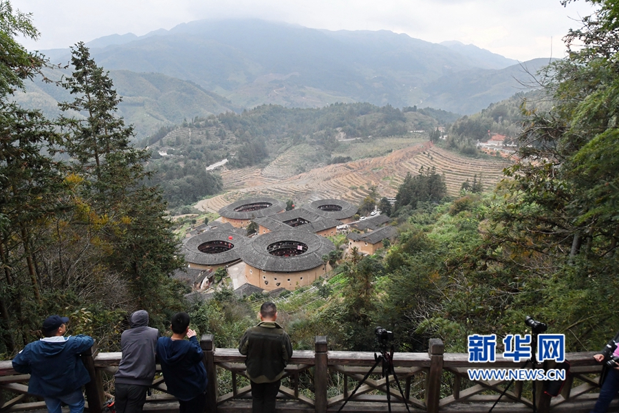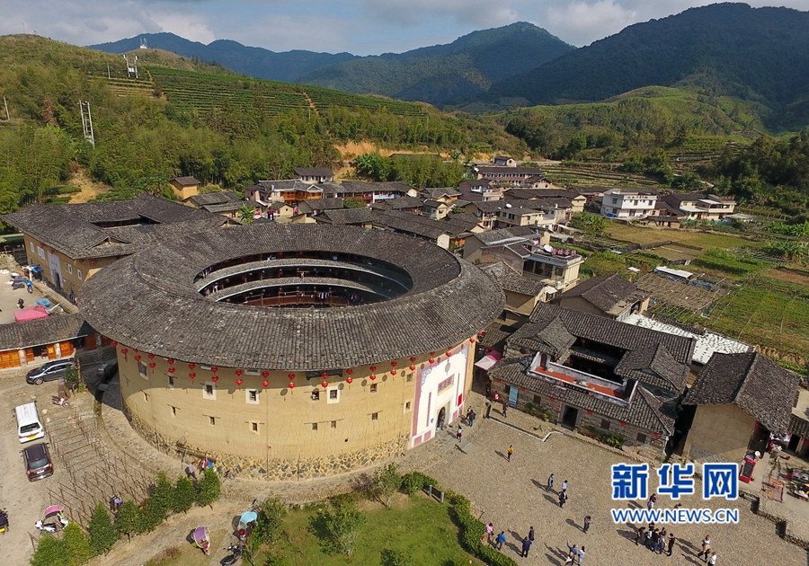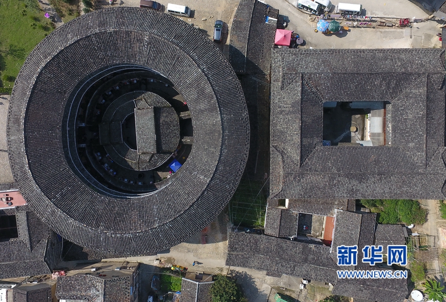 這是由中間的一座方樓和圍繞其四周的三座圓樓、一座橢圓樓組成的大型土樓民居——福建土樓(南靖)景區(qū)的田螺坑土樓群。新華社記者林善傳攝