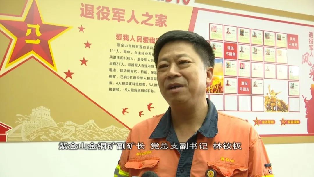 林欽權(quán) 紫金山金銅礦副礦長(zhǎng) 黨總支副書記 這些退伍軍人在我們整個(gè)紫金山金銅礦的生產(chǎn)、安全各方面發(fā)揮了非常重要的作用。我們還專門成立了應(yīng)急救援隊(duì)伍,都是以退伍軍人為主,我們的礦山救護(hù)隊(duì)也是以退伍軍人為主,他們?cè)谧辖鹕浇疸~礦應(yīng)急救援的方方面面起到了非常重要的作用。 為持續(xù)推動(dòng)單位擁軍文化建設(shè),今年8月份,紫金山金銅礦還成立了全縣首家企業(yè)“退役軍人之家”,主動(dòng)給予退役軍人就業(yè)扶持,關(guān)注困難退役軍人的家庭情況和生活狀況,及時(shí)幫助他們解決生活和工作中遇到的問題,讓退役軍人們實(shí)實(shí)在在地感受到企業(yè)的關(guān)懷與溫暖。