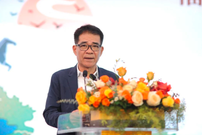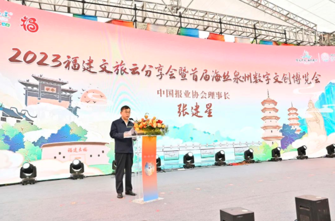 中國報(bào)業(yè)協(xié)會理事長張建星致辭。福建省文旅廳供圖 泉州市政府副市長陳小輝介紹了泉州多民族文化交融、山海文化氣息兼?zhèn)洹⒆诮涛幕矘s的地域文化特征。他表示,泉州搶抓世遺城市和數(shù)字經(jīng)濟(jì)的時(shí)代紅利,推動(dòng)數(shù)字文創(chuàng)產(chǎn)業(yè)加速布局。
