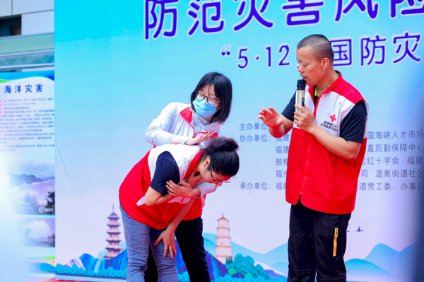 活動(dòng)現(xiàn)場(chǎng),駐省應(yīng)急廳紀(jì)檢監(jiān)察組和省退役軍人事務(wù)廳領(lǐng)導(dǎo)為社區(qū)居民代表發(fā)放急救包;省減災(zāi)中心向東大社區(qū)贈(zèng)送《臺(tái)風(fēng)知識(shí)與應(yīng)急避險(xiǎn)》繪本;福建省紅十字現(xiàn)場(chǎng)救護(hù)培訓(xùn)中心的老師們現(xiàn)場(chǎng)互動(dòng)教授創(chuàng)傷包扎方法和氣道梗阻急救法(海姆利克急救法)。