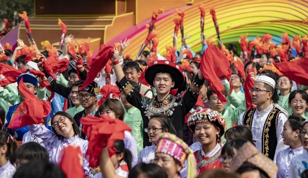 群眾游行隊(duì)伍中,有大批學(xué)生、年輕工人、青年農(nóng)民。他們朝氣蓬勃、意氣風(fēng)發(fā),展現(xiàn)出新一代青年人奮發(fā)進(jìn)取、昂揚(yáng)向上的精神面貌。