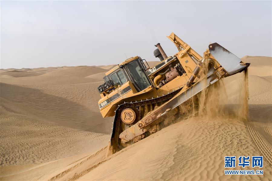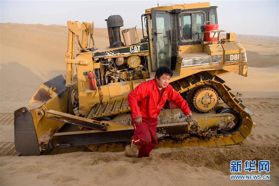 在塔克拉瑪干沙漠腹地,東方物探塔里木物探處2113隊的推土機手胡軍爬上大沙包觀察前方沙漠情況(1月13日攝)。新華社記者 丁磊 攝 新華社烏魯木齊2月3日電(記者顧煜、宿傳義)“今天一定要把這片沙漠路推出來?!碧爝€未完全放亮,一陣發(fā)動機的轟鳴已喚醒沉寂的塔克拉瑪干大沙漠腹地。為“伙伴”推土機做完體檢后,胡軍擦了擦手上的黑油,開始在連綿的沙丘中顛簸…… 今年47歲的胡軍是東方物探塔里木物探處2113隊的一名推土機手,2019年10月,塔里木油田中古14-21三維、塔中2三維物探項目開工,胡軍再次進入塔克拉瑪干沙漠腹地。 作為沙漠里尋找油氣的第一道工序,胡軍和工友們每天要開著推土機,在“死亡之?!彼死敻纱笊衬沟赝坡?。3000多平方公里的施工面積,起伏不定的沙丘,沙丘最大落差超過80米……“沙包太大,不推路,后續(xù)班組無法工作。”