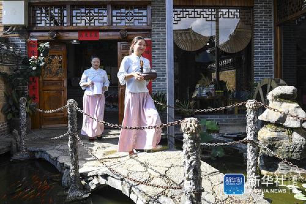 ↑7月4日,服務(wù)員在廣西陽朔一家民宿內(nèi)忙碌。她們是陽朔縣陽朔鎮(zhèn)的村民。