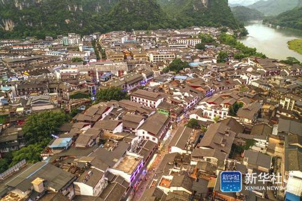 ↑7月4日拍攝的位于漓江邊的廣西陽朔縣西街(無人機照片)。這條歷史悠久的步行街內(nèi)有不少民宿酒店,旅游旺季時經(jīng)常一房難求。 |
