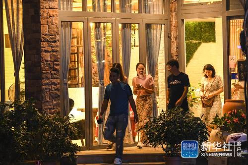 ↑7月4日,幾名游客從廣西陽朔縣西街景區(qū)一家民宿酒店走出。
