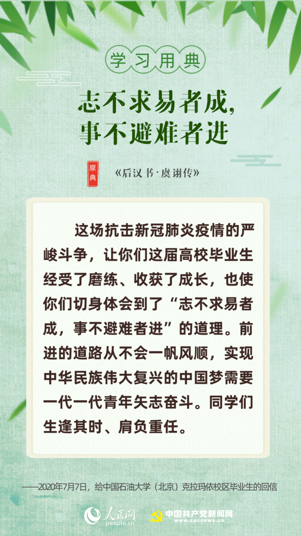 2020-07-13 14:11:55 來源:人民網(wǎng)-中國(guó)共產(chǎn)黨新聞網(wǎng) 責(zé)任編輯:陳瑋 作者:【編者按】“志不求易者成,事不避難者進(jìn)?!苯?,習(xí)近平總書記給中國(guó)石油大學(xué)(北京)克拉瑪依校區(qū)畢業(yè)生回信,對(duì)廣大高校畢業(yè)生提出殷切期望。“人生在勤,勤則不匱”“積土而為山,積水而為海”……近年來,習(xí)近平多次引用詩句典故,激勵(lì)包含廣大青年在內(nèi)的全黨全國(guó)各族人民拼搏奮進(jìn)、埋頭苦干。正值“戰(zhàn)疫”“戰(zhàn)貧”關(guān)鍵時(shí)刻,人民網(wǎng)·中國(guó)共產(chǎn)黨新聞網(wǎng)與您一起回顧習(xí)近平講話中關(guān)于“奮斗”的10個(gè)名句。