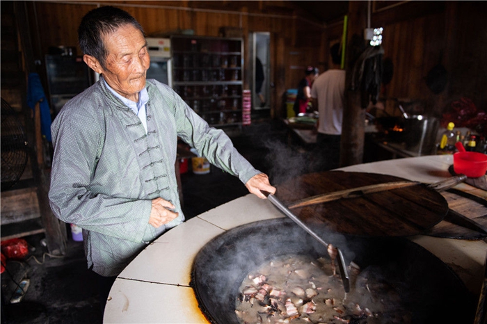 在湘西十八洞村,82歲的施成富在自家的農家樂里炒臘肉(6月29日攝)。新華社記者 陳思汗 攝 2013年11月3日 習近平總書記在這里首次提出“精準扶貧” 這個“地無三尺平,多是斗笠丘”的小山村 一夜間 聞名遐邇
