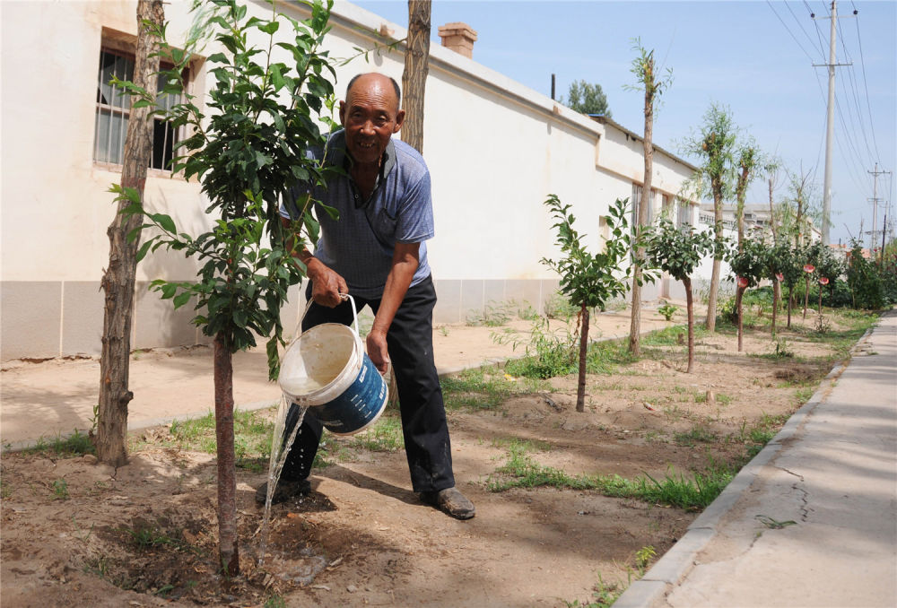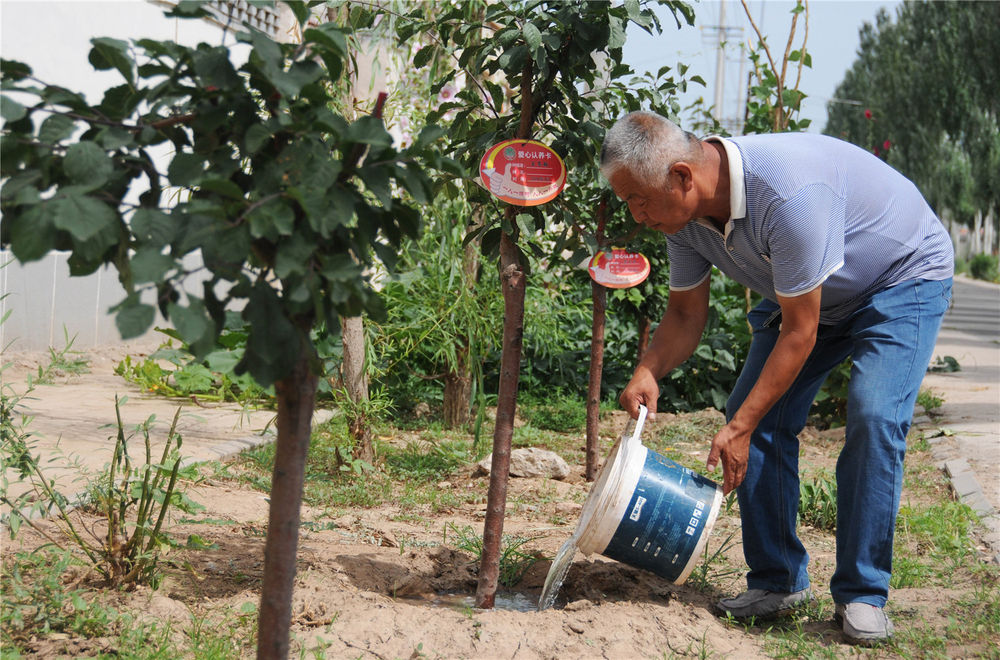 梁興泰正在給自己栽種的果樹澆水。(新華社記者李云平攝影) 八一村街道兩側(cè)都種著杏樹、蘋果梨樹等,每棵樹上還掛著紅色的愛心認養(yǎng)卡,上面標(biāo)有種植者、時間等。 村婦聯(lián)主任丁艷君說:“為了增加大家管護樹木的責(zé)任感和榮譽感,我們在樹上掛了愛心認養(yǎng)卡,時刻提醒村民照顧好自己的樹苗,這些被認養(yǎng)的樹苗全部成活,沒有一棵受到損傷?!?/p>
