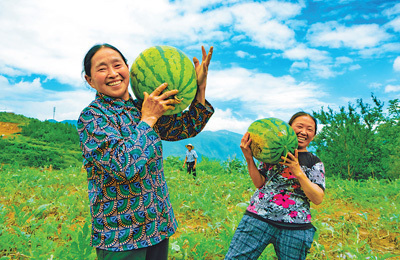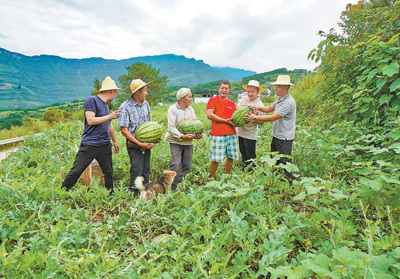 駐村工作隊(duì)員(右一、右二)與村民一起采摘西瓜。 這兩天,重慶市豐都縣三建鄉(xiāng)夜力坪村的西瓜豐收了。 一年前,經(jīng)過多次調(diào)研,駐村扶貧工作隊(duì)決定在村里種植優(yōu)質(zhì)大西瓜時(shí),卻沒有村民愿意栽種。 不愿意放棄的扶貧工作隊(duì)員,決心帶頭做出個(gè)樣子來。當(dāng)年,2畝西瓜,畝產(chǎn)達(dá)6000斤,銷售收入2萬余元??吹阶孀孑呡叿N玉米的土地真的種出了大西瓜,村民們紛紛跟進(jìn)種植。今年,40余戶村民自愿種植上百畝西瓜,雖受雨水影響,但預(yù)計(jì)畝產(chǎn)仍達(dá)到5000斤以上,戶均增收能達(dá)上萬元。 蔣云龍 何良樹攝影報(bào)道 |
