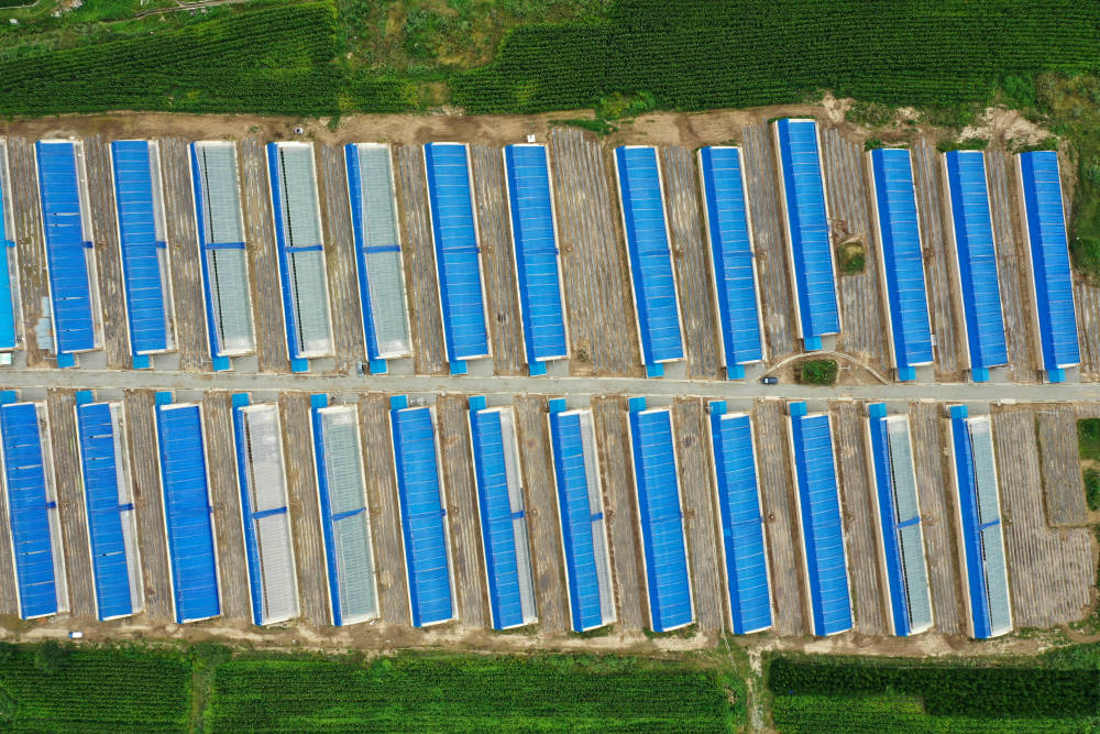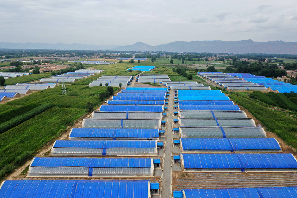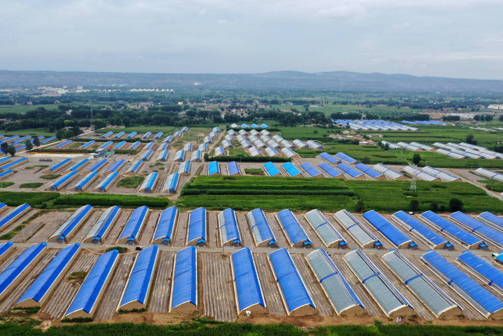 這是8月11日拍攝的甘肅省臨夏回族自治州臨夏縣易地扶貧搬遷后續(xù)產(chǎn)業(yè)發(fā)展日光溫室建設(shè)項目(無人機照片)。新華社記者 邢廣利 攝