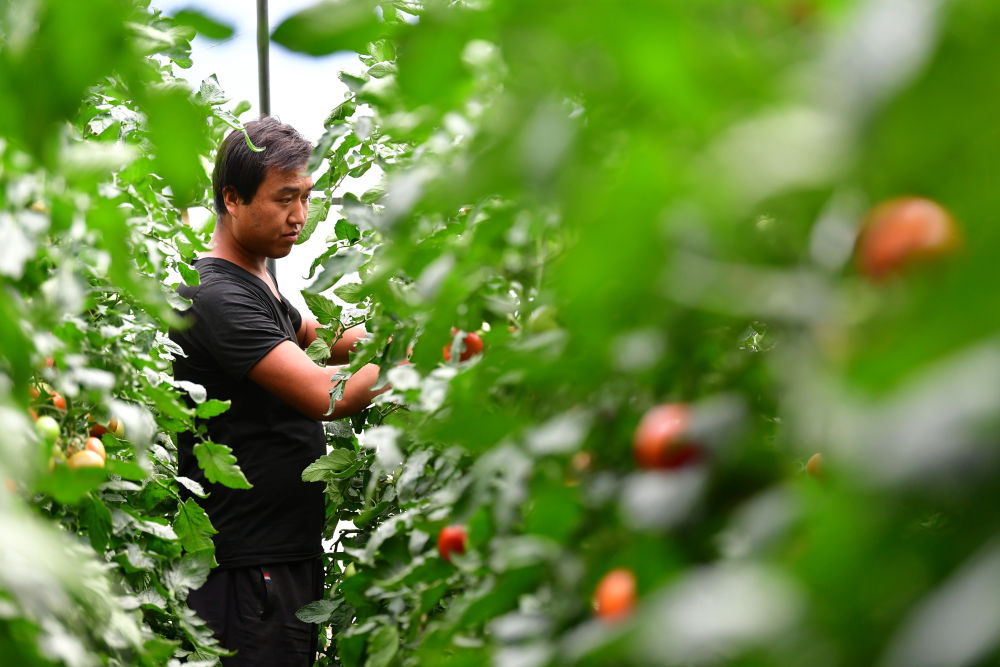 8月11日,在甘肅省臨夏回族自治州臨夏縣先鋒鄉(xiāng)前韓村,搬遷戶蔣元財在日光溫室內(nèi)采摘西紅柿。新華社記者 陳斌 攝