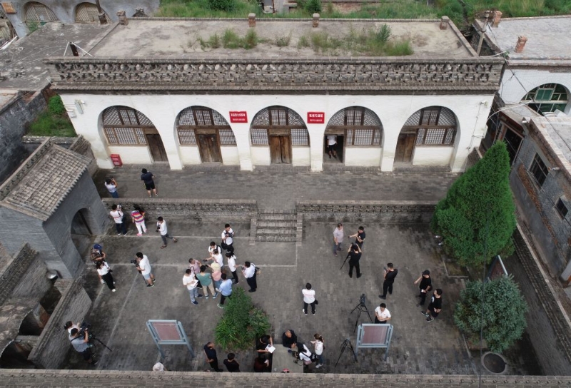 參加“記者再走長征路”活動(dòng)的媒體記者在陜西省子長縣瓦窯堡會(huì)議舊址采訪(2019年8月9日攝,無人機(jī)照片)。新華社記者 羅曉光 攝