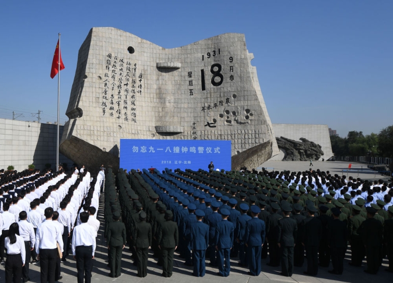 勿忘“九一八”撞鐘鳴警儀式在遼寧省沈陽市“九一八”歷史博物館殘歷碑廣場舉行(2018年9月18日攝)。新華社記者 潘昱龍 攝