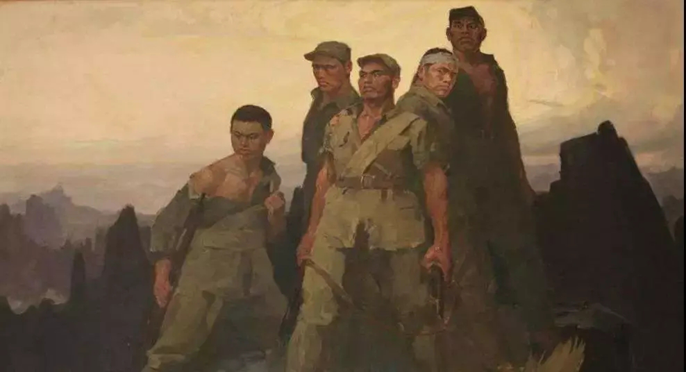 1941年9月,在易縣狼牙山為掩護(hù)主力部隊(duì)和人民群眾安全轉(zhuǎn)移,5名八路軍戰(zhàn)士同數(shù)千日軍巧妙周旋一整天,將敵人引上絕路,跳崖?tīng)奚?。圖為狼牙山五壯士。(油畫(huà)作品) 打完最后一顆子彈 狼牙山五壯士砸碎從敵人手中搶來(lái)的槍 毅然跳崖就義