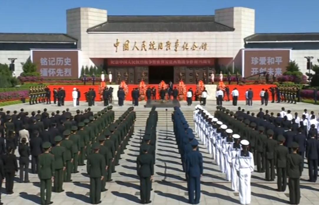 9月3日上午10時,中共中央總書記、國家主席習(xí)近平等黨和國家領(lǐng)導(dǎo)人出席了在中國人民抗日戰(zhàn)爭紀(jì)念館舉行的紀(jì)念中國人民抗日戰(zhàn)爭暨世界反法西斯戰(zhàn)爭勝利75周年向抗戰(zhàn)烈士敬獻(xiàn)花籃儀式。在雄壯嘹亮的國歌聲中,習(xí)近平總書記同首都各界代表向在中國人民抗日戰(zhàn)爭中英勇犧牲的革命烈士敬獻(xiàn)花籃。