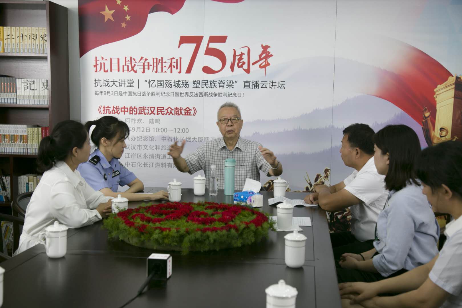 八路軍武漢辦事處舊址紀(jì)念館邀請武漢文化名人何祚歡做客直播間,講述了1938年周恩來、郭沫若等人號召的武漢市民支援抗戰(zhàn)的獻(xiàn)金運(yùn)動故事,深切地回憶了在祖國生死存亡之際,中國人民誓死捍衛(wèi)祖國的愛國情懷和“天下興亡、匹夫有責(zé)”的民族大義,并組織20余名黨員及全體干部職工舉行了莊嚴(yán)紀(jì)念儀式。