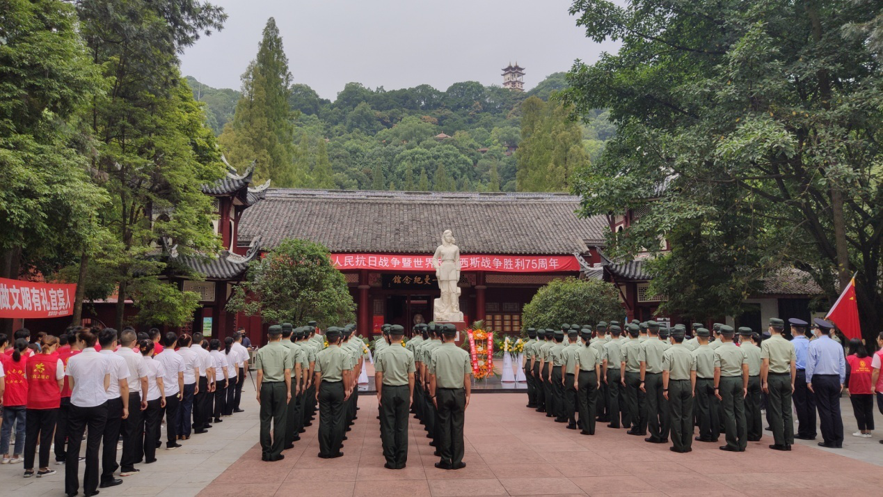 趙一曼紀(jì)念館聯(lián)合駐宜賓部隊陸航旅、宜賓市志愿服務(wù)聯(lián)合會、四川省宜賓監(jiān)獄等單位200余人在一曼廣場舉行紀(jì)念儀式。各單位代表向在抗日戰(zhàn)爭中犧牲的革命先烈和死難同胞敬獻(xiàn)花籃。