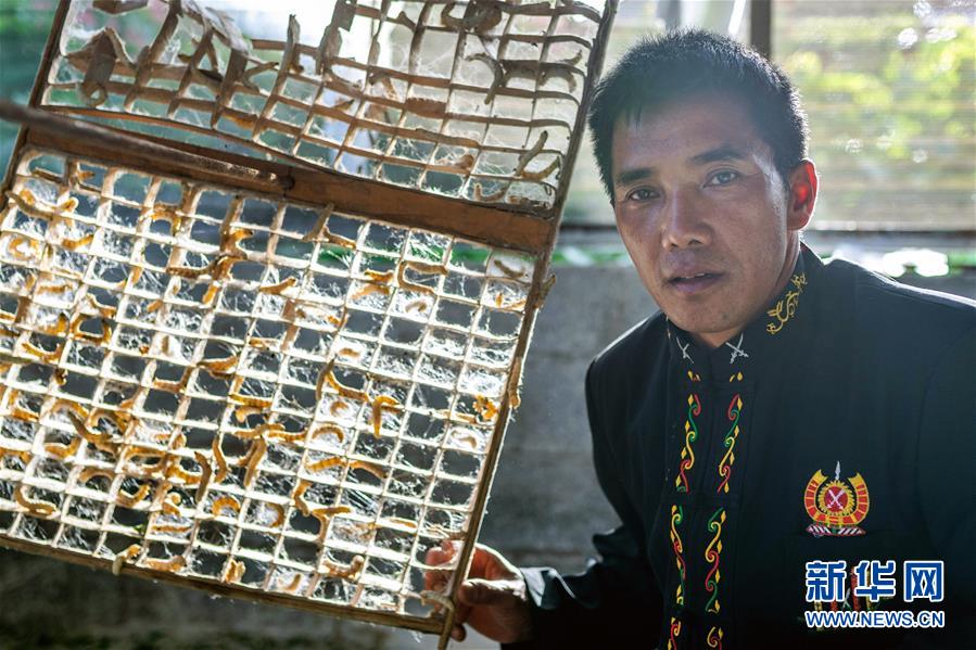 在云南省隴川縣隴把鎮(zhèn)曼崩村,董跑約在蠶棚里給“蠶寶寶”喂桑葉(8月21日攝)。 新華社記者 胡超 攝 曼崩村氣候溫和,田地肥沃,水資源豐富,適合種桑養(yǎng)蠶。“一開始并非所有村民都敢養(yǎng)蠶,大家怕白費工夫?!倍瓨蛳嗾f,為了讓群眾吃下“定心丸”,激發(fā)大家的積極性,隴把鎮(zhèn)黨委政府派出黨員干部進村入戶宣講蠶桑產(chǎn)業(yè)扶持政策,引進企業(yè)專業(yè)技術(shù)人員,到田間地頭開展培訓(xùn),手把手教會村民種桑養(yǎng)蠶。 董跑約告訴記者,種桑養(yǎng)蠶第一年每畝桑葉可養(yǎng)殖一張蠶種,平均一張蠶種產(chǎn)繭45公斤,以最低價格每公斤36.8元計算,一張蠶種平均收入1656元;第二年起每畝可養(yǎng)殖兩張蠶種,畝均收入3300元左右。今年他家種了16畝桑樹,預(yù)計收入超過5萬元。 曼崩村家家戶戶參與到了種桑養(yǎng)蠶行列中。2019年底,全村年人均純收入達到7826元,成功脫貧出列。