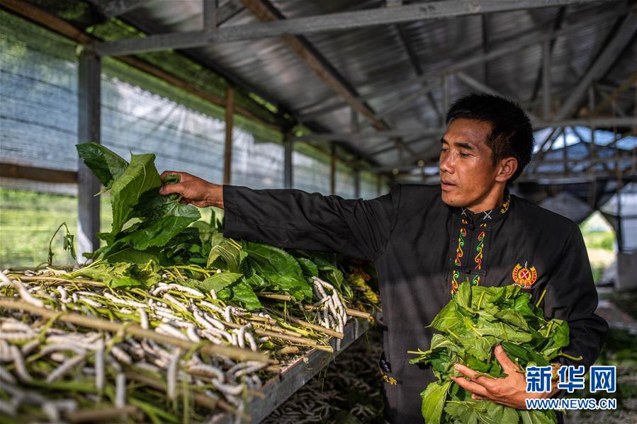 2020-09-05 21:40:24 來源:新華網(wǎng) 責(zé)任編輯:黃麗紅 作者:字強、胡超新華社昆明9月5日電 題:遍身羅綺者,亦是養(yǎng)蠶人——云南偏遠邊疆村寨奔小康 新華社記者字強、胡超 中緬邊境,萬畝綠油油的桑樹向陽生長,郁郁蔥蔥。 49歲的景頗族漢子董跑約在桑田里忙碌著,他要把鮮嫩的桑葉及時收割下來,喂養(yǎng)蠶棚里的幼蠶。他種了大半輩子甘蔗、水稻,經(jīng)歷了吃不飽、穿不暖、住茅草房的苦日子,近三年種桑養(yǎng)蠶后,不僅收入翻番、吃穿不愁,還蓋了新房、買了轎車。 董跑約所在的云南省隴川縣隴把鎮(zhèn)曼崩村是一個景頗族村落,有農(nóng)戶52戶236人,其中建檔立卡貧困戶21戶69人。 新中國成立前,董跑約的先輩們困居深山叢林中,以狩獵、刀耕火種為生,直到20世紀(jì)末才陸續(xù)搬到如今的曼崩村。 董跑約告訴記者,搬出大山后,村民們在茅草房里熬了很長一段時期,直到2006年,在國家政策幫扶下,村民們才蓋起土木結(jié)構(gòu)的瓦房。2014年國家啟動精準(zhǔn)扶貧工程,村民們又陸續(xù)新建了磚房,實現(xiàn)“安居夢”。 “最大的改變還是產(chǎn)業(yè)?!倍芗s說,種水稻、玉米勉強夠吃,賺不來錢。近年來,政府鼓勵村民種桑養(yǎng)蠶,大家的收入一下子提高了很多。 據(jù)隴把鎮(zhèn)黨委書記董橋相介紹,2017年以來,在上海市青浦區(qū)對口幫扶下,曼崩村陸續(xù)種植了500余畝桑樹,連年大豐收,村民們邁入了增收致富的“快車道”。
