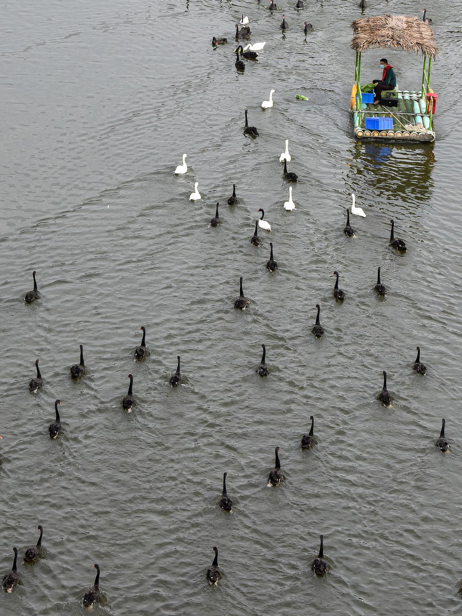 2月11日,佩戴口罩的飼養(yǎng)員在廣州長(zhǎng)隆野生動(dòng)物世界天鵝湖喂天鵝。