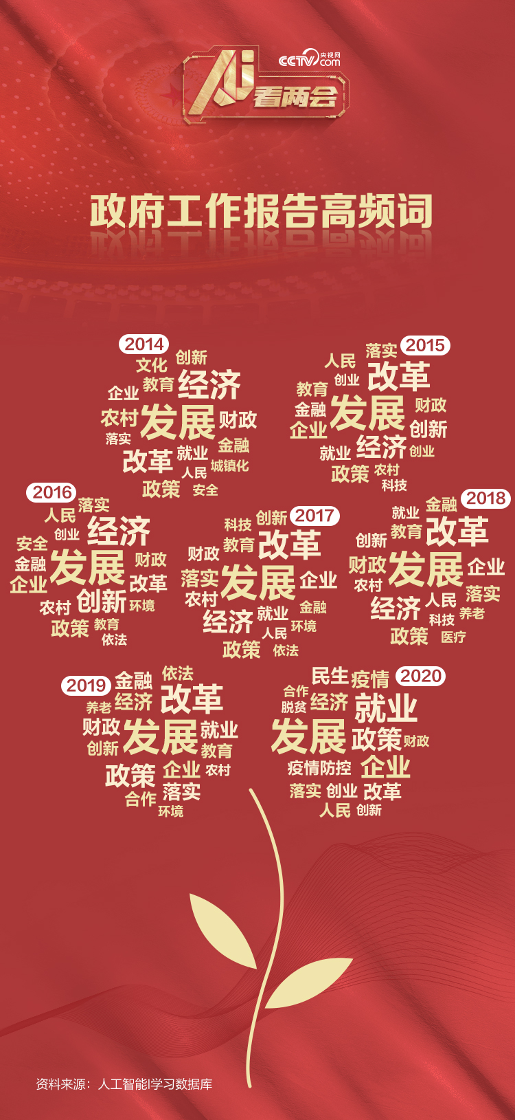 依托人工智能I學習數(shù)據(jù)庫,央視網(wǎng)人工智能編輯部還分析了2014年以來每一份政府工作報告的高頻詞。