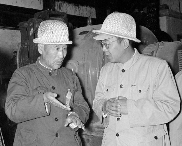 這是孟泰(左)和包鋼副經(jīng)理李超一起研究烘爐出鐵的問(wèn)題。新華社記者陸軻攝(1959年9月22日發(fā)) 沈陽(yáng)、唐山、合肥、大連等地的企業(yè)日夜趕制設(shè)備;北京軍區(qū)、空軍和民航派出汽車和飛機(jī),為包鋼運(yùn)送物資和設(shè)備。