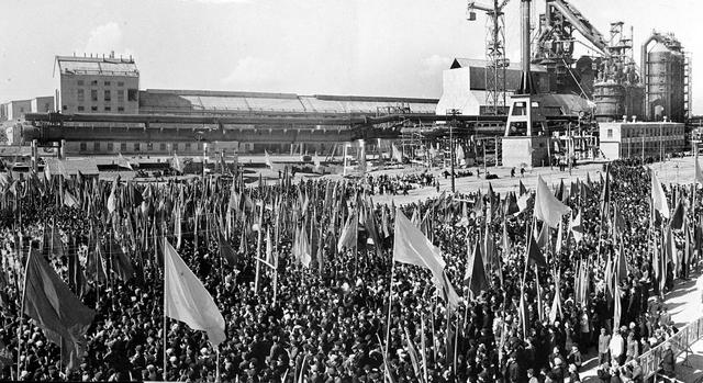 1959年10月15日,在包鋼一號(hào)高爐前面廣場(chǎng)上,舉行了出鐵剪彩典禮大會(huì)。 新華社記者李基祿、陸軻攝 在這里,流出第一爐鐵水,結(jié)束了草原上寸鐵不產(chǎn)的歷史。然而,包鋼建設(shè)之初困難重重,隱含著一段齊心協(xié)力的光輝歲月。 1958年,包鋼正處于大規(guī)模建設(shè)時(shí)期,人們熱切期望的一號(hào)高爐建設(shè)卻遇到了設(shè)備和建設(shè)材料供應(yīng)不足的難題。 黨中央很重視包鋼建設(shè),提出“要想辦法為包鋼解決困難”。全國(guó)上下,各地區(qū)、各企業(yè)、各部門積極行動(dòng),掀起一場(chǎng)全國(guó)支援包鋼的熱潮。 平均每天有10多個(gè)車皮的設(shè)備和材料從全國(guó)各地運(yùn)到包鋼。這些材料和設(shè)備來(lái)自22個(gè)省55個(gè)市300多個(gè)企業(yè)。 鞍鋼除發(fā)運(yùn)鋼材外,還支援干部、工人7000多人,鞍鋼老英雄、全國(guó)勞動(dòng)模范孟泰帶著幾名技師也來(lái)到包鋼支援建設(shè),協(xié)助解決技術(shù)難題。