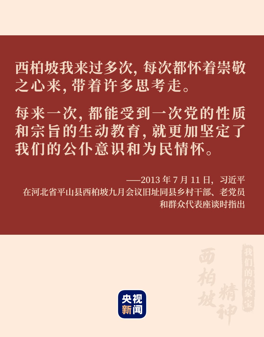 2013年7月,習(xí)近平總書記來到革命圣地西柏坡,瞻仰舊址??倳浱栒偃h同志,要不斷學(xué)習(xí)領(lǐng)會“兩個務(wù)必”的深邃思想,始終做到謙虛謹慎、艱苦奮斗、實事求是、一心為民,繼續(xù)把人民對我們黨的“考試”、把我們黨正在經(jīng)受和將要經(jīng)受各種考驗的“考試”考好,使我們的黨永遠不變質(zhì)、我們的紅色江山永遠不變色。