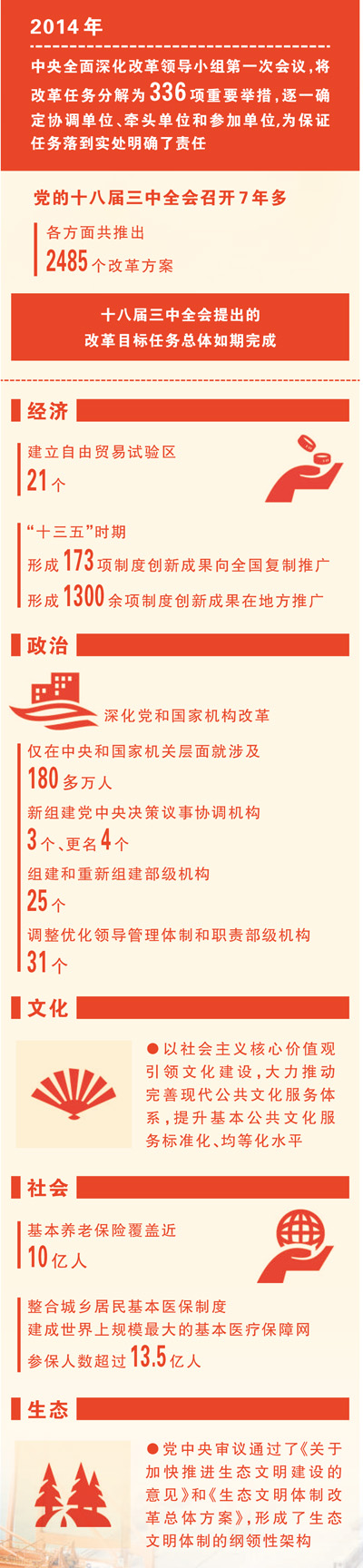 中國(guó)(廣西)自由貿(mào)易試驗(yàn)區(qū)欽州港片區(qū)的集裝箱碼頭?! ⌒氯A社記者 曹祎銘攝 2013年11月9日至12日,黨的十八屆三中全會(huì)在北京舉行。 全會(huì)聽取和討論了習(xí)近平總書記受中央政治局委托作的工作報(bào)告,審議通過了《中共中央關(guān)于全面深化改革若干重大問題的決定》。習(xí)近平總書記就《決定(討論稿)》向全會(huì)作了說明。 這是一份具有里程碑意義的宣言書,對(duì)中國(guó)走什么路、向何處去這個(gè)帶有方向性、戰(zhàn)略性的重大問題作出了旗幟鮮明的回答:高舉改革開放旗幟、努力開拓中國(guó)特色社會(huì)主義事業(yè)更加廣闊的前景。 這是一份具有劃時(shí)代意義的藍(lán)圖,對(duì)在新的歷史起點(diǎn)上全面深化改革作出戰(zhàn)略部署,在理論上有一系列重大創(chuàng)新,在實(shí)踐上有一系列重大突破,為實(shí)現(xiàn)中華民族偉大復(fù)興的中國(guó)夢(mèng),勾勒出改革路線圖和時(shí)間表。 新世紀(jì)新階段,改革開放航船,沿著黨的十一屆三中全會(huì)以來開辟的正確航道,又一次揚(yáng)帆起航。 宏偉壯麗的改革事業(yè)到了關(guān)鍵時(shí)刻 看似尋常最奇崛,成如容易卻艱辛。 時(shí)間回溯到2013年金秋。 此時(shí)的中國(guó),再次來到了事關(guān)前途命運(yùn)的歷史關(guān)口。經(jīng)濟(jì)長(zhǎng)期高速增長(zhǎng)過程中積累的一系列深層次矛盾不斷積聚,舊的問題解決了,新的問題又產(chǎn)生,必須在更多領(lǐng)域、更深層次全面深化改革。 ——全面建成小康社會(huì)、加快推進(jìn)社會(huì)主義現(xiàn)代化的宏偉藍(lán)圖,要求全面深化改革; ——堅(jiān)持和發(fā)展中國(guó)特色社會(huì)主義,要求全面深化改革; ——解決中國(guó)發(fā)展面臨的一系列突出矛盾和挑戰(zhàn),實(shí)現(xiàn)經(jīng)濟(jì)社會(huì)持續(xù)健康發(fā)展,要求全面深化改革; ——順應(yīng)時(shí)代潮流,滿足人民期待,保持黨和國(guó)家生機(jī)活力,要求全面深化改革…… 時(shí)代課題,擺在新一屆黨中央領(lǐng)導(dǎo)集體面前。 廣東、河北、甘肅、海南、天津、四川、湖北、遼寧、湖南……黨的十八大以來,習(xí)近平總書記調(diào)研的足跡遍及大江南北,遍及社區(qū)、鄉(xiāng)村、企業(yè)、學(xué)校??倳浺陨铄涞亩床炝透呶萁驳膽?zhàn)略眼光,提出了全面深化改革需要調(diào)查研究的6個(gè)重大問題—— 進(jìn)一步形成全國(guó)統(tǒng)一的市場(chǎng)體系,形成公平競(jìng)爭(zhēng)的發(fā)展環(huán)境;進(jìn)一步增強(qiáng)經(jīng)濟(jì)發(fā)展活力,為實(shí)現(xiàn)經(jīng)濟(jì)持續(xù)健康發(fā)展提供不竭動(dòng)力;進(jìn)一步提高宏觀調(diào)控水平,提高政府效率和效能;進(jìn)一步增強(qiáng)社會(huì)發(fā)展活力,促進(jìn)社會(huì)和諧穩(wěn)定;進(jìn)一步實(shí)現(xiàn)社會(huì)公平正義,通過制度安排更好保障人民群眾各方面權(quán)益;進(jìn)一步提高黨的領(lǐng)導(dǎo)水平和執(zhí)政能力,充分發(fā)揮黨總攬全局、協(xié)調(diào)各方的作用。 這6個(gè)重要課題,直指中國(guó)改革發(fā)展的關(guān)鍵。 1978年,黨的十一屆三中全會(huì)如平地驚雷,打破堅(jiān)冰,開啟波瀾壯闊的改革開放航程。 2013年,宏偉壯麗的改革事業(yè)又一次到了關(guān)鍵時(shí)刻,決定著中華民族復(fù)興偉業(yè)的圓夢(mèng)藍(lán)圖徐徐展開。 為謀定未來作出全面系統(tǒng)的戰(zhàn)略部署 2013年11月12日,中國(guó)再次吸引了世界關(guān)注的目光。 下午3時(shí),黨的十八屆三中全會(huì)舉行閉幕會(huì),出席全會(huì)的中央委員經(jīng)表決,一致通過了《中共中央關(guān)于全面深化改革若干重大問題的決定》。 當(dāng)習(xí)近平總書記宣布《決定》通過時(shí),會(huì)場(chǎng)上響起了熱烈的掌聲。 翻開這份決定,從以經(jīng)濟(jì)體制改革為主到全面深化經(jīng)濟(jì)、政治、文化、社會(huì)、生態(tài)文明體制和黨的建設(shè)制度改革,是新中國(guó)成立以來最為全面系統(tǒng)的改革部署。 “相比過去,新時(shí)代改革開放具有許多新的內(nèi)涵和特點(diǎn),其中很重要的一點(diǎn)就是制度建設(shè)分量更重,改革更多面對(duì)的是深層次體制機(jī)制問題,對(duì)改革頂層設(shè)計(jì)的要求更高,對(duì)改革的系統(tǒng)性、整體性、協(xié)同性要求更強(qiáng),相應(yīng)地建章立制、構(gòu)建體系的任務(wù)更重。”習(xí)近平總書記鮮明指出新時(shí)代改革開放的特點(diǎn)。 十八屆三中全會(huì)把國(guó)家治理體系和治理能力建設(shè)擺到更加突出的位置,通過加強(qiáng)頂層設(shè)計(jì)、系統(tǒng)配套、整體推進(jìn),為謀定未來作出了全面系統(tǒng)的戰(zhàn)略部署。 ——《決定》明確了全面深化改革的總目標(biāo),體現(xiàn)了中國(guó)共產(chǎn)黨人的政治勇氣:完善和發(fā)展中國(guó)特色社會(huì)主義制度,推進(jìn)國(guó)家治理體系和治理能力現(xiàn)代化。 ——《決定》指出了全面深化改革的目的,體現(xiàn)了中國(guó)共產(chǎn)黨人的必勝信心:進(jìn)一步解放思想、解放和發(fā)展社會(huì)生產(chǎn)力、解放和增強(qiáng)社會(huì)活力。 ——《決定》部署了全面深化改革的重點(diǎn),體現(xiàn)了中國(guó)共產(chǎn)黨人的堅(jiān)