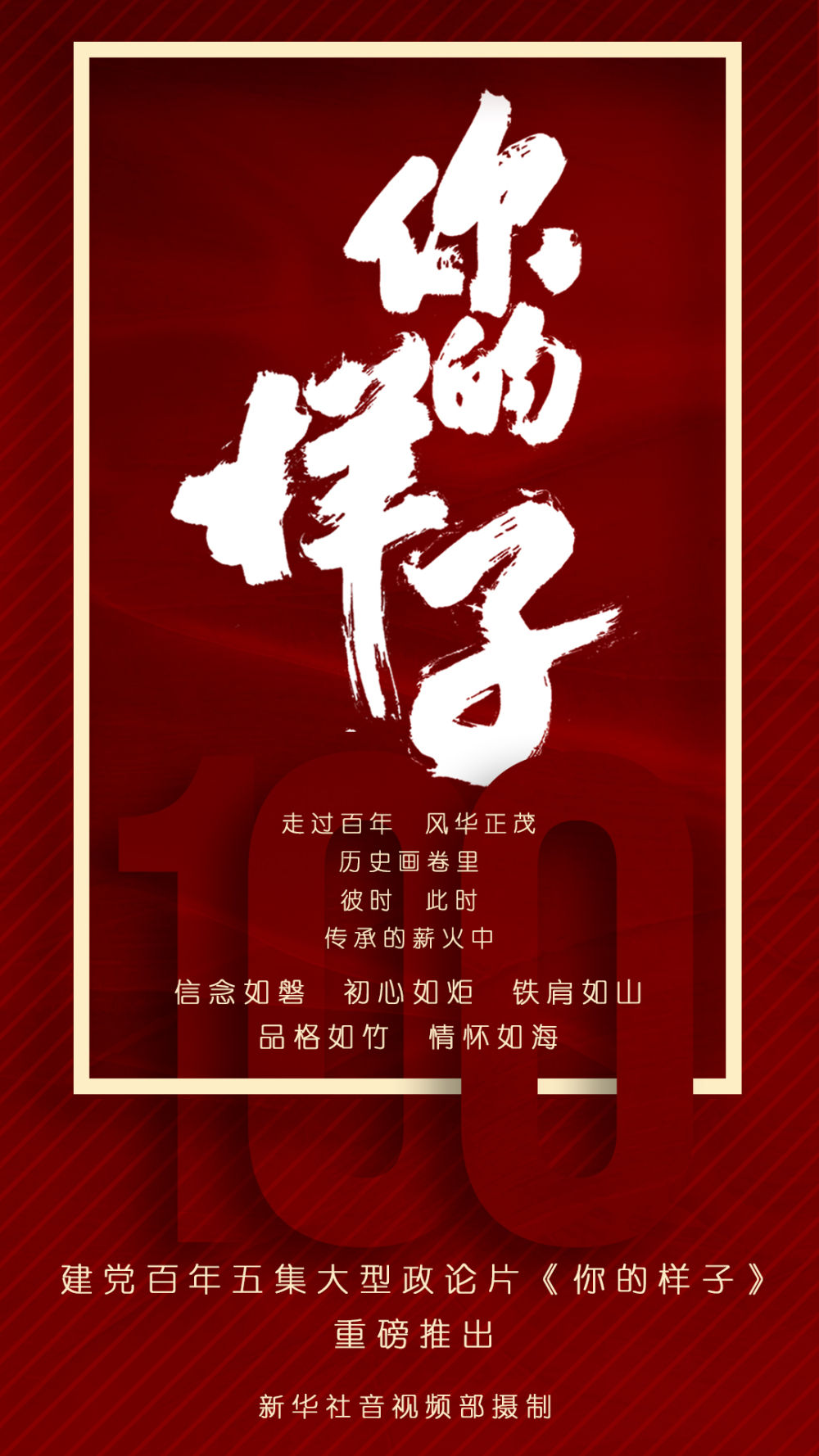 征途漫漫 道阻且長 百年滄桑 依舊風(fēng)華正茂 建黨百年之際 新華社為中國共產(chǎn)黨畫像 用全新方式講述中國共產(chǎn)黨 砥礪奮進(jìn)的百年歷史 以感天動(dòng)地的故事 取新穎獨(dú)特的視角 回答歷史之問 2021年6月15日—6月19日 建黨百年五集大型政論片《你的樣子》 敬請期待 新華社音視頻部攝制